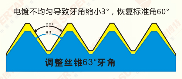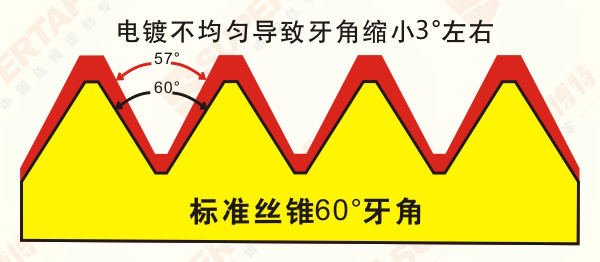 經(jīng)過改變絲錐的牙形角度,施工出來的牙角度變大,電鍍以后,角度變小,恢復(fù)到標(biāo)準(zhǔn)角度。