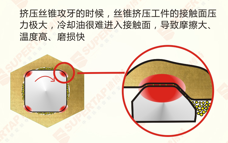 擠壓絲錐是利用工件的可朔性,通過(guò)強(qiáng)有力的摩擦擠壓工件,使其變形,產(chǎn)生螺紋。絲錐與工件接觸面之間的摩擦與壓力是非常的巨大的。即使在攻牙的過(guò)程中進(jìn)行油冷,但是接觸面之間由于摩擦與壓力巨大,油是很難進(jìn)入接觸面之間起到良好的潤(rùn)滑作用。